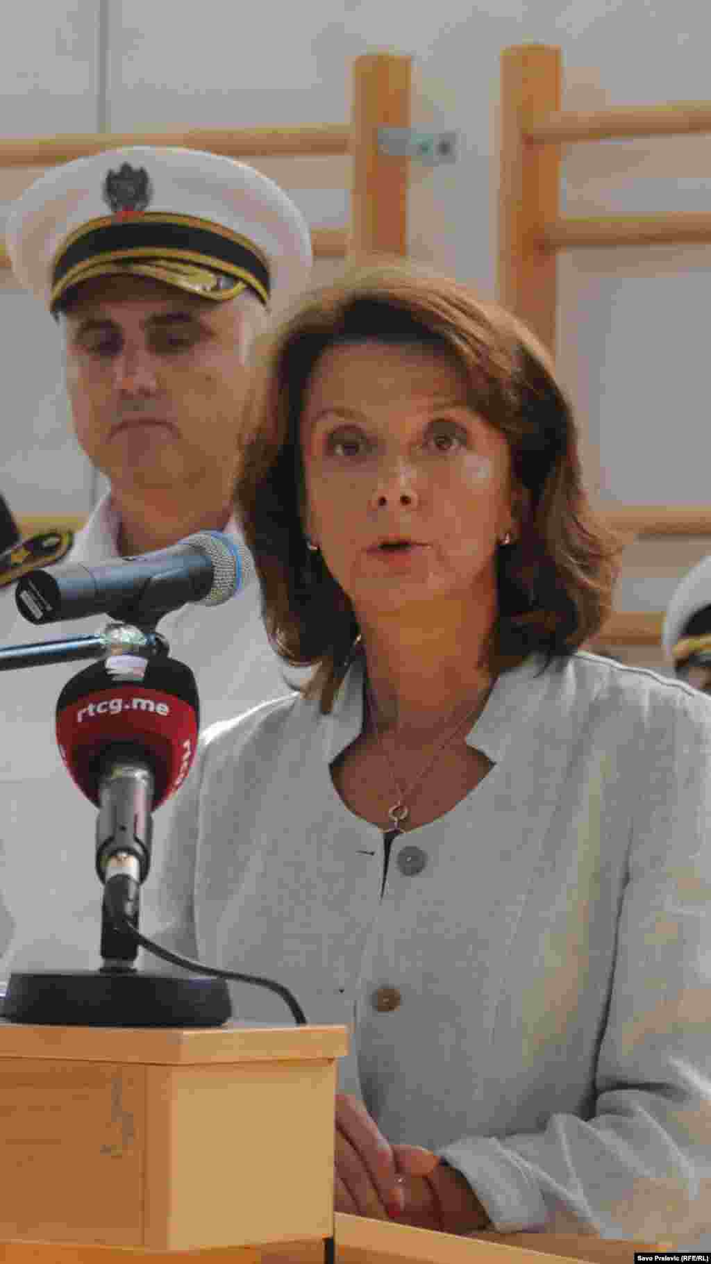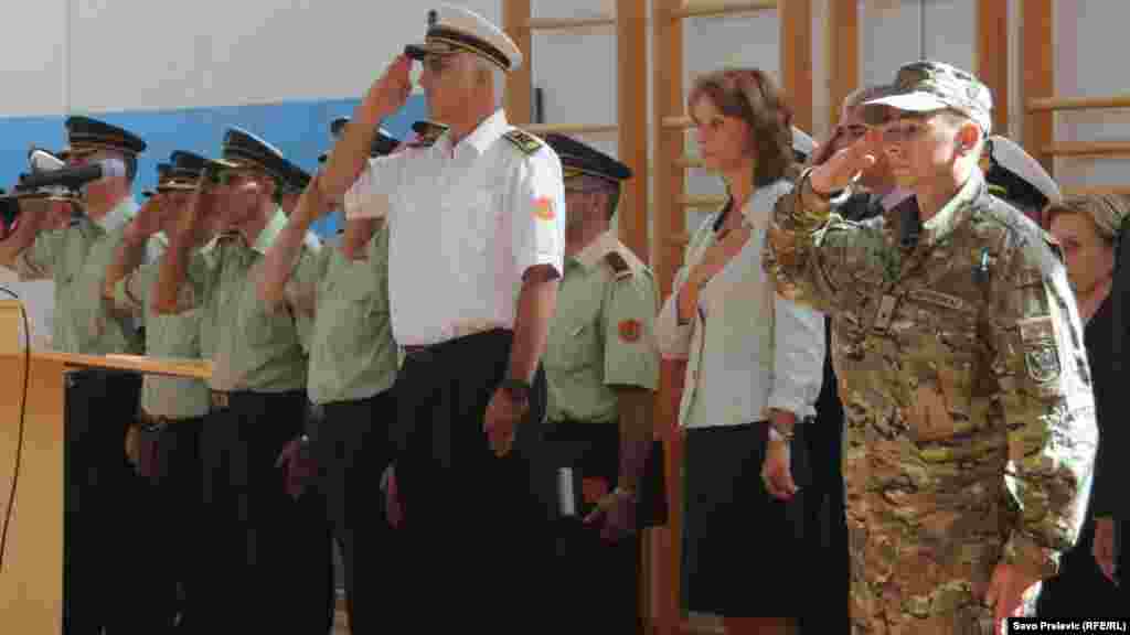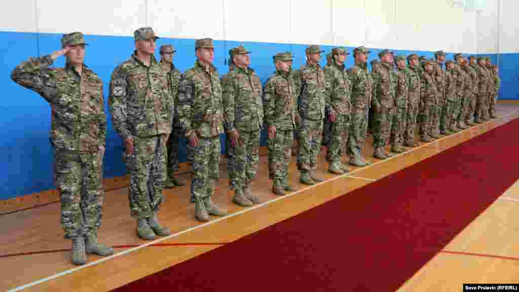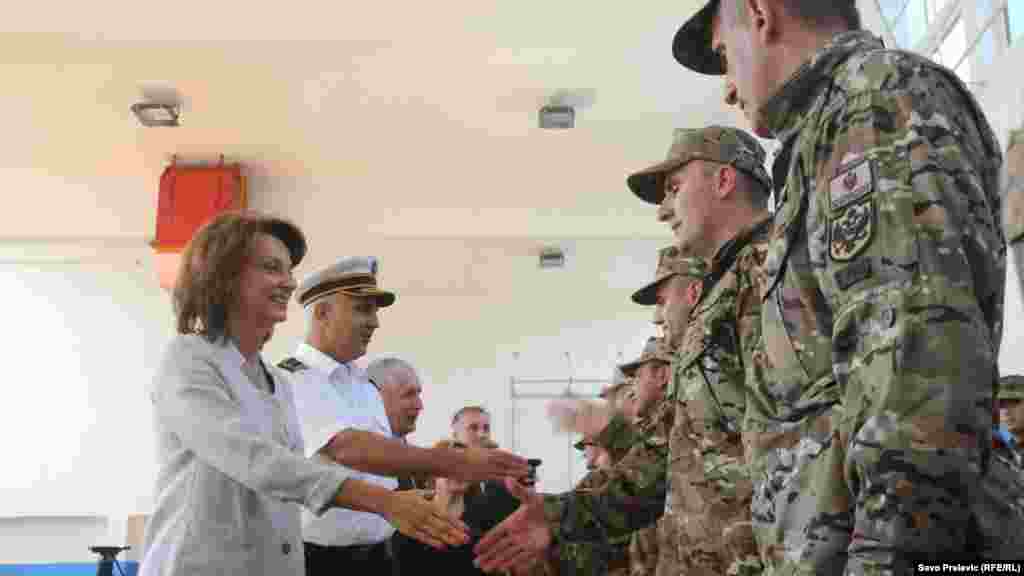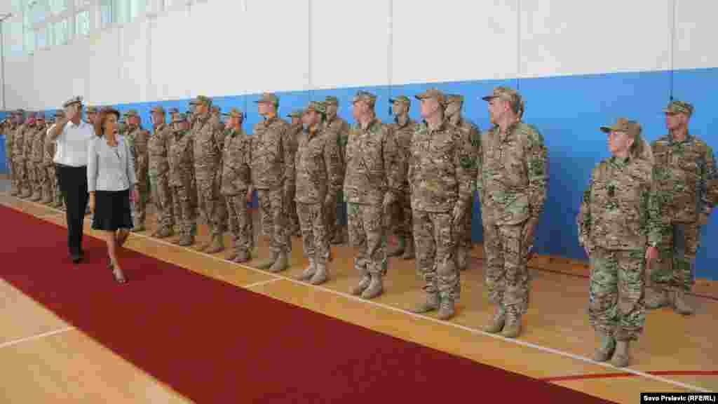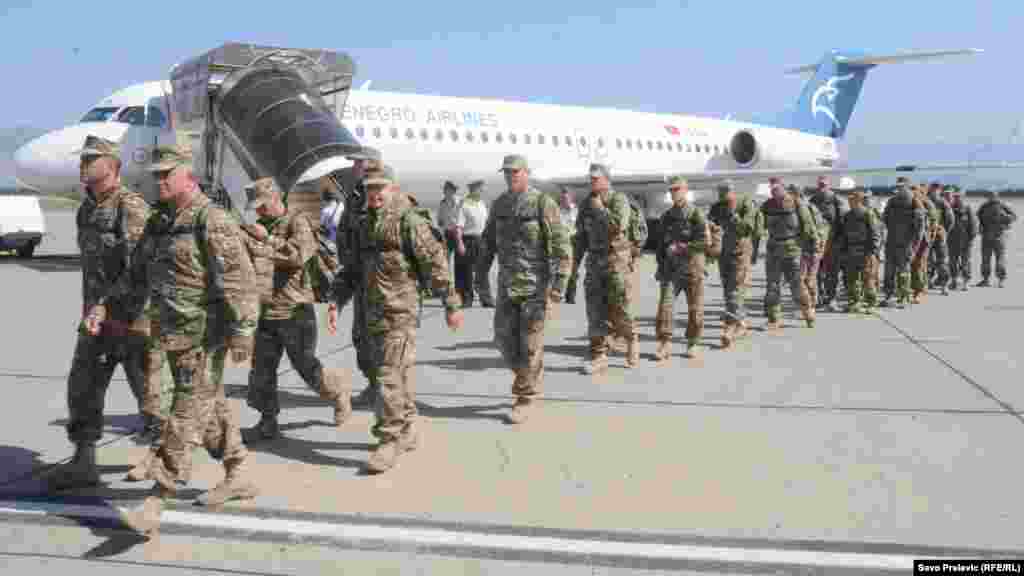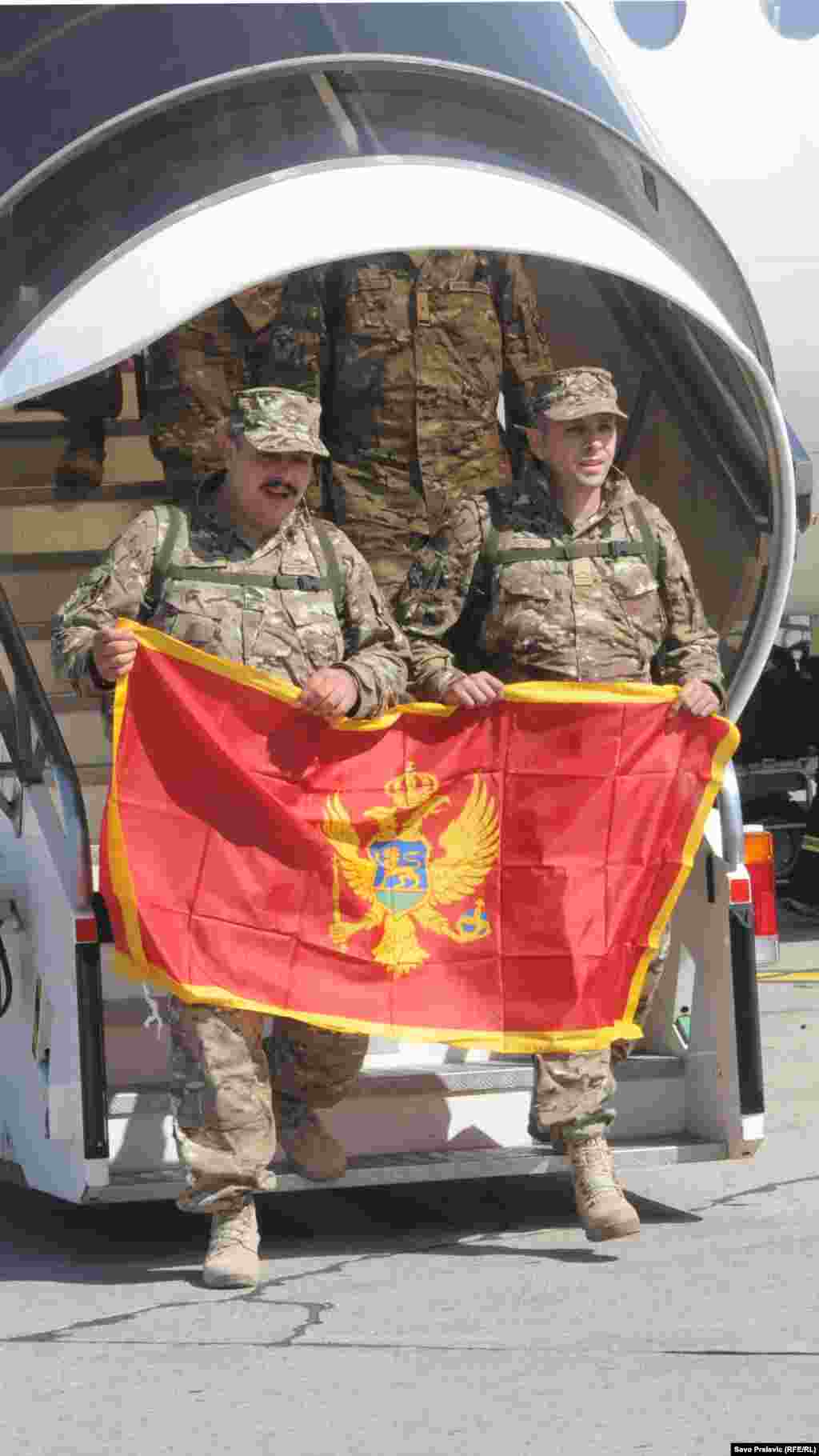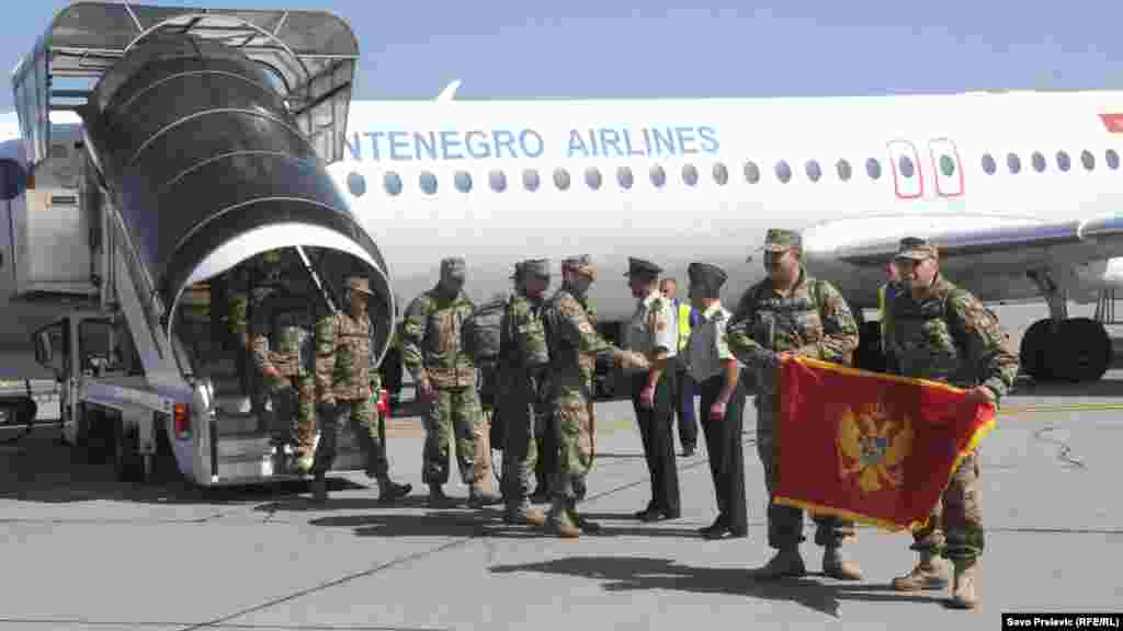 Peti kontigent crnogorske vojske, nakon sedam i pol mjeseci provedenih u Afganistanu, vratio se u Podgoricu. Na aerodromu Golubovci priređen im je svečani doček, a među prvima su ih pozdravili Milica Pejanović Đurišić, ministrica odbrane i načelnik Generalštaba viceadmiral Dragan Samardžić. Foto: RSE / Savo Prelević, 27. septembar 2012.
