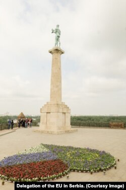 Cvetna instalacija u obliku srca u bojama zastava Srbije i Evropske unije postavljena je na Kalemegdanu u Beogradu.