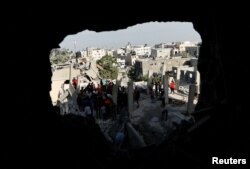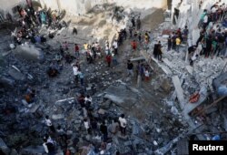 Palestinci pretražuju ruševine uništenih zgrada nakon izraelskog napada na ovo područje.
