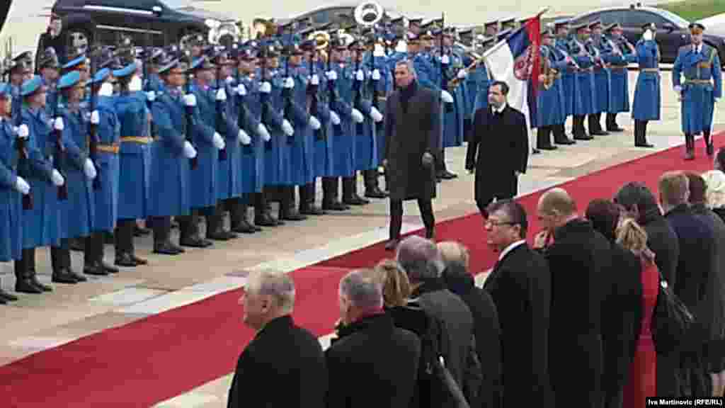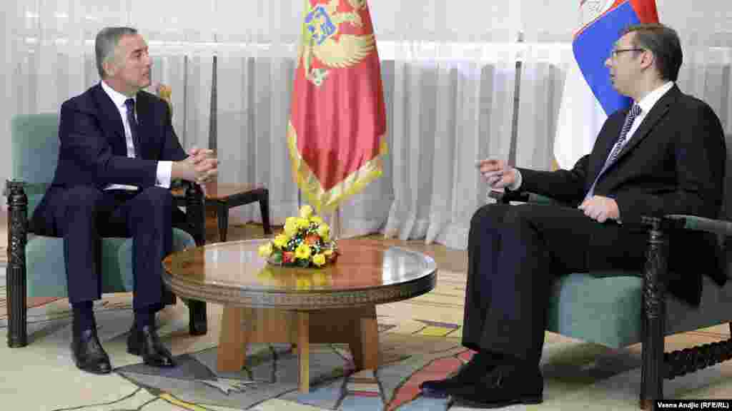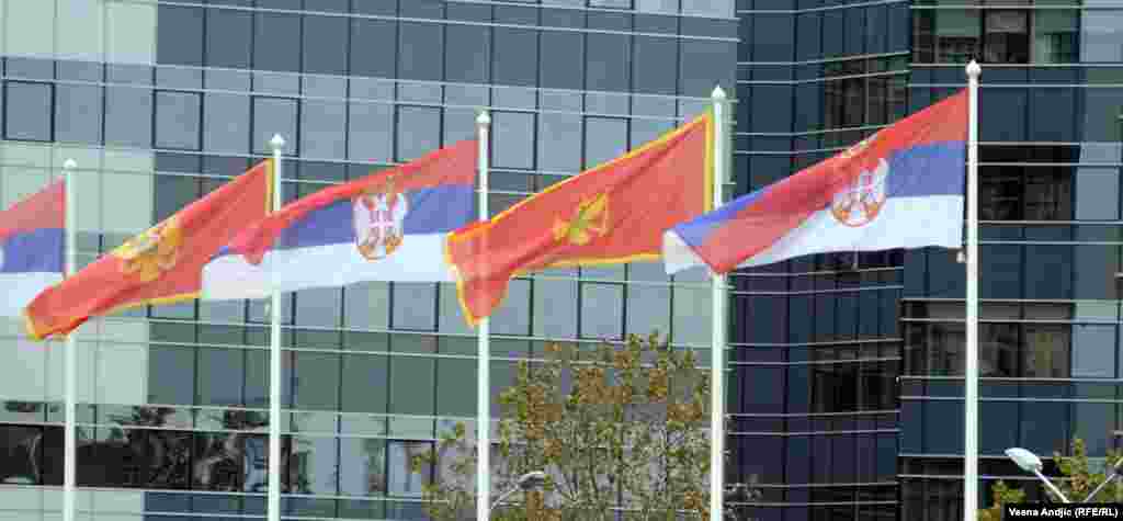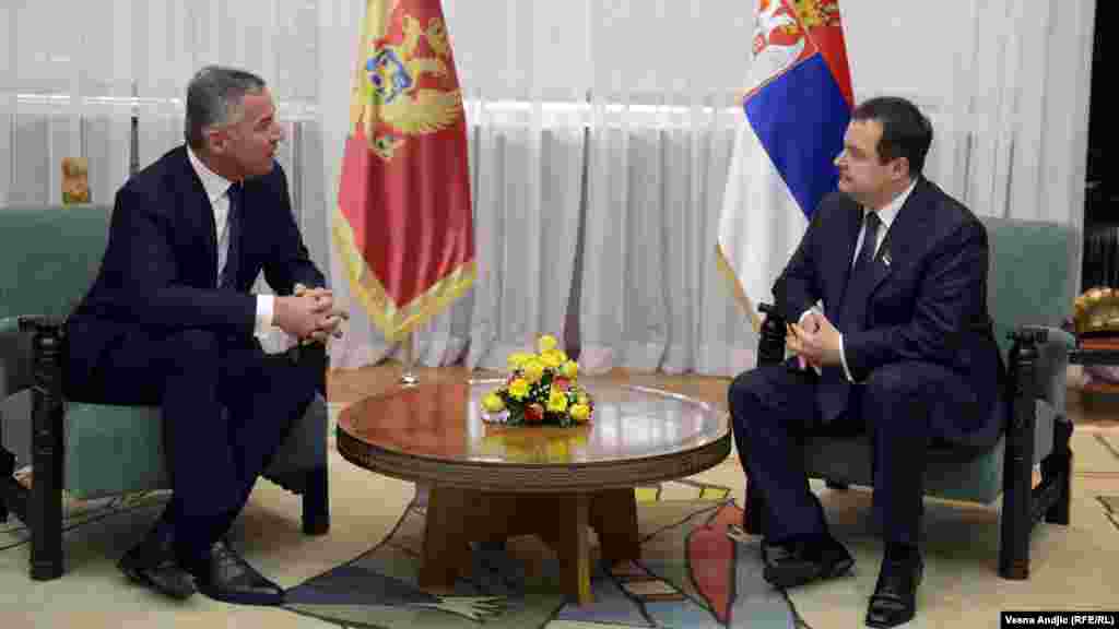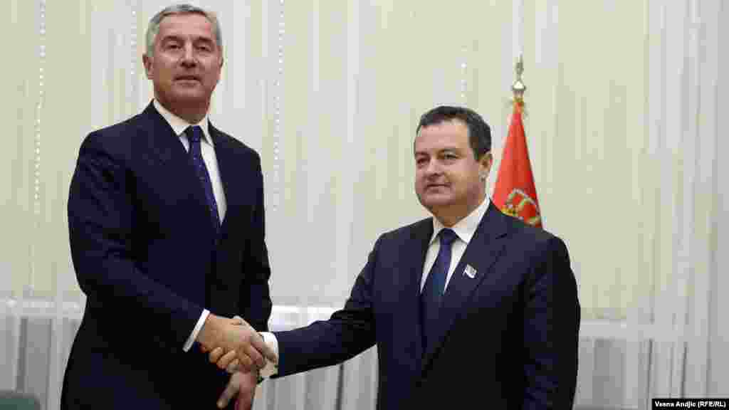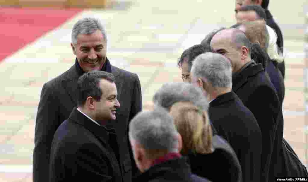 Premijer Crne Gore Milo Đukanović drugi dan zvanične posete Srbiji sastao se sa premijerom i potpredsednikom Vlade, kao i sa predsednikom Skupštine Srbije. Premijer Ivica Dačić dočekao je Đukanovića ispred Palate Srbija, nakon čega su dvojica premijera počeli sastanak u četiri oka. Posle tog susreta Đukanović je razgovarao i sa prvim potpredsednikom Vlade Srbije Aleksandrom Vučićem. Foto: RSE / Vesna Anđić, 10. decembar 2013.
