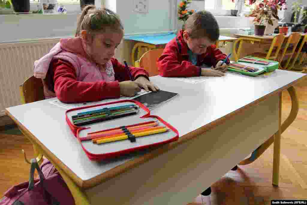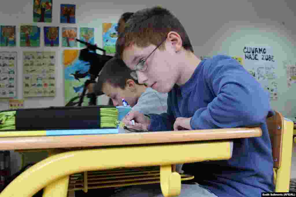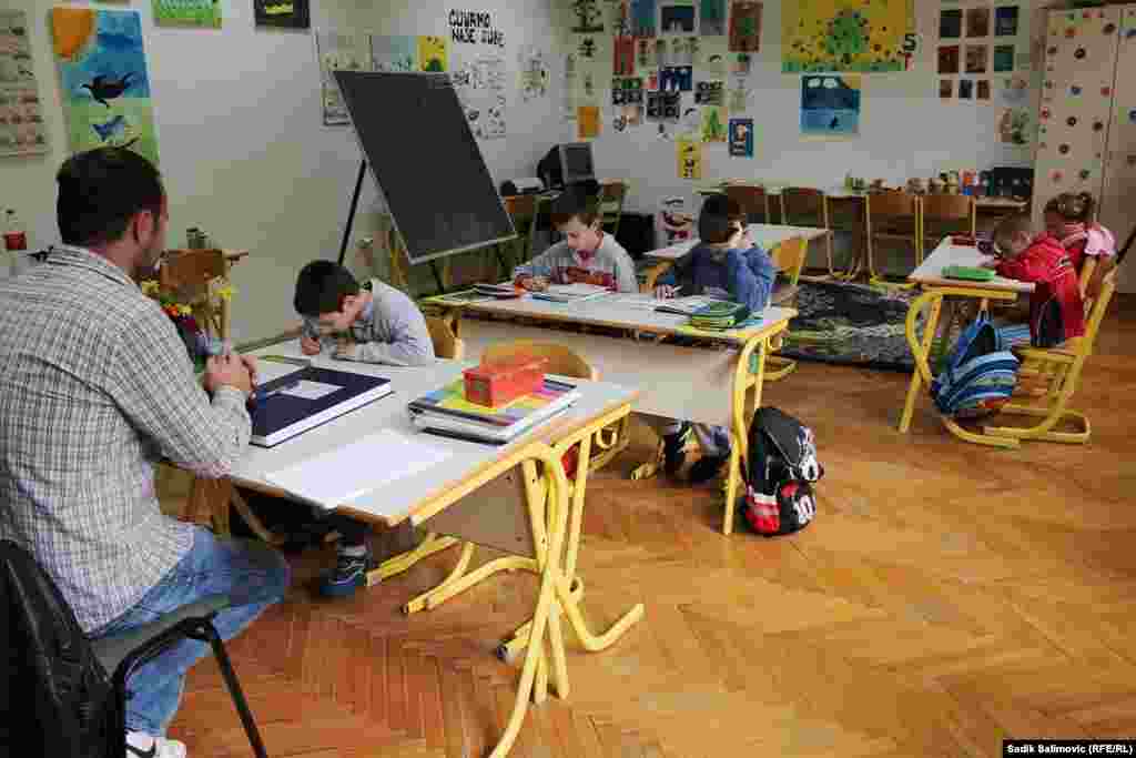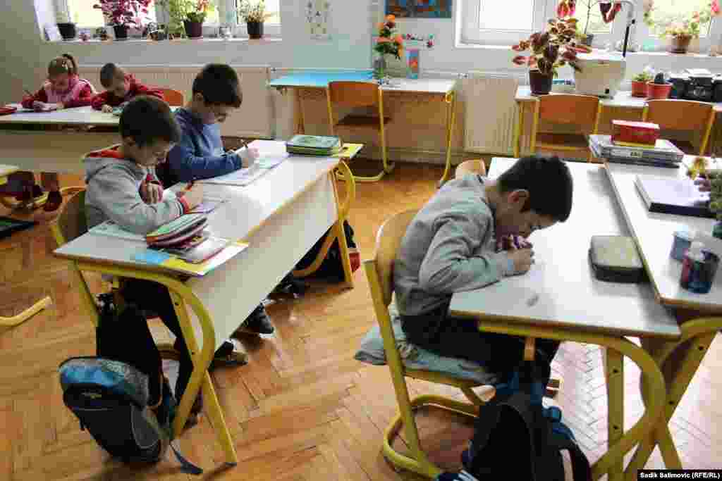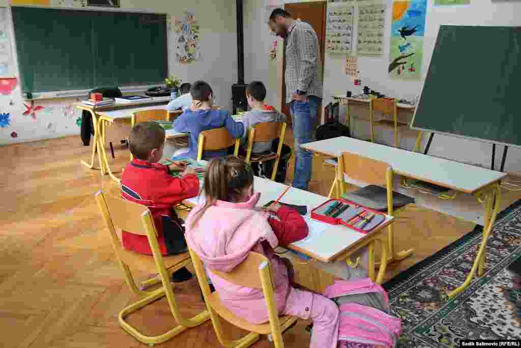 U Prvoj osnovnoj školi Srebrenica, područno odjeljenje Sase, u četiri razreda je svega šest učenika. Prvi razred pohađaju Filip i Anđela, drugi razred je Adelisa, u trećem je Marko, a u petom su Filip i Stefan. Četvrti razred ne pohađa niko. U ovoj školi nema potrebe za školskim zvonom, a kraj časa je kada kažu učitelji. RSE/Foto: Sadik Salimović